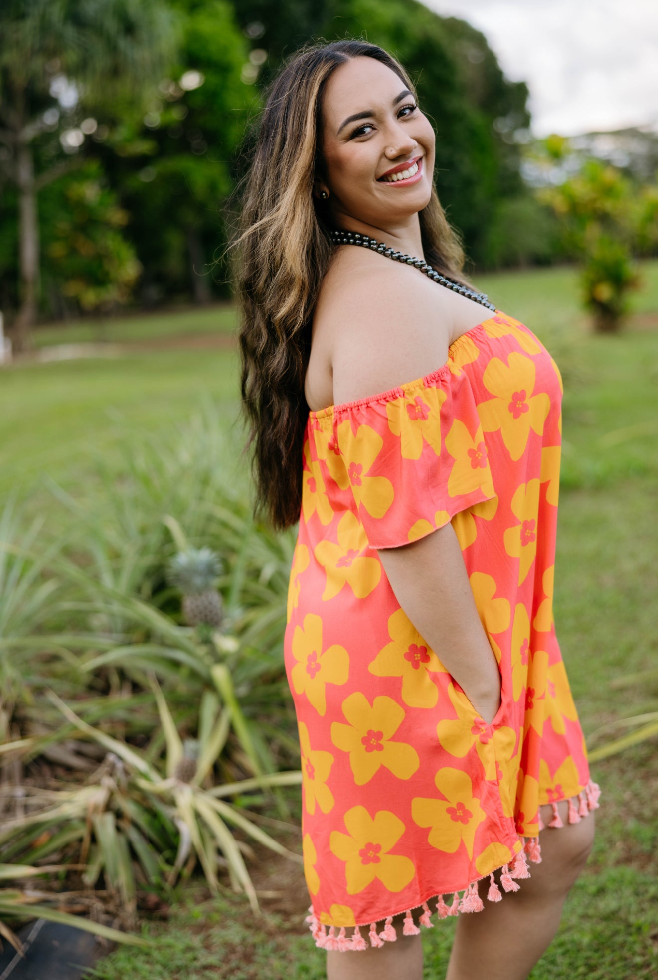 Say aloha to sunshine in the Karly Dress—your new go-to for flirty, fun, and feel-good days. This off-the-shoulder stunner is made with lightweight, breathable fabric that moves with you and features bold yellow blooms on our signature Lemi Akala (pink lemonade) base.